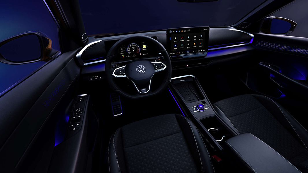 Gli interni di Nuovo T‑Roc segnano un vero salto di qualità grazie all'uso di materiali premium. Il design minimalista e sofisticato e la plancia rivestita in tessuto soft-touch donano all'abitacolo un'atmosfera elegante. Il display touch centrale da 12,9” consente di controllare con facilità le funzioni di navigazione, la musica e altro ancora. L'atmosfera è resa più accogliente grazie all'illuminazione ambiente a 30 colori, alle modanature luminose sulle porte, ai sedili in ArtVelours e al climatizzatore automatico a 3 zone.
